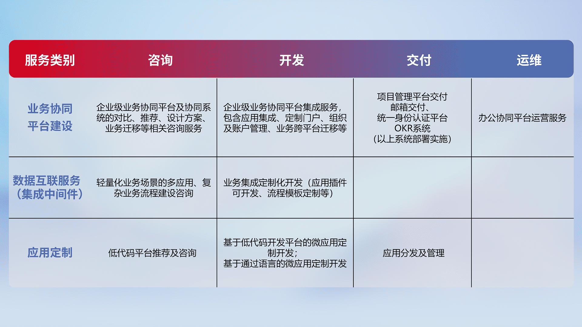针对钉钉、、企微、、IDaas等平台级产品提供产品的规划、、、、方案、、、、交付、、定制化开发等服务,,实现如统一协同办公、、智能客户服务、、、、混合会议管理、、、智能数据查询、、、等业务场景,,,,实现数字化转型。。。。